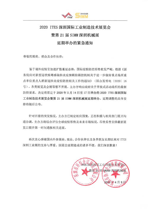 鑒于目前全國人民抗擊新型冠狀病毒感染肺炎疫情的攻堅戰已進入關鍵時刻,及暨第21屆SIMM深圳機械展組委會的通知,原定于2020年3月30日開展的ITES深圳工業展暨第21屆SIMM深圳機械展延期舉辦。展會延期給您帶來的諸多不便,我們深表歉意,敬請諒解!